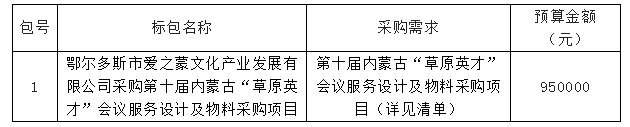 項目名稱:鄂爾多斯市愛之蒙文化產業發展有限公司采購第十屆內蒙古“草原英才”會議服務設計及物料采購項目